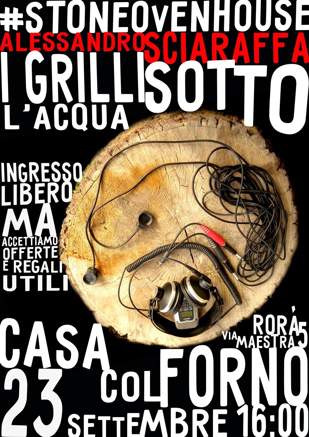 I Grilli Sotto l'Acqua is an immersive installation by Alessandro Sciaraffa. A sensory experience from afternoon to night. First, the banks of the stream and its sounds are explored with the artist, then we immerse ourselves in audiovisual projections lying in the barn at the Stone Oven House. Then we continue in front of the bonfire, we shrink grilling on the fire. And then maybe we dive again.